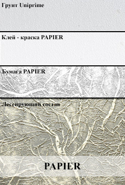 Валиком со средним ворсом нанести на поверхность клей-краску толстым слоем. Не давая высохнуть клей-краске приклеить заранее подготовленные куски бумаги на поверхность и пригладить ладонью руки или обойным шпателем (без сильного нажима). Бумага клеится в нахлест 1-5 см. Чтобы избежать видимых стыков, края бумаги подогнуть и оформить как складки с общим рисунком. Нанести второй слой (тонкий) клей краски (по желанию можно колеровать). После полного высыхания (24 часа) материал можно покрасить краской, нанести матовую лессировку для подчеркивания рисунка или покрыть перламутровой лессировкой. Для улучшения эксплуатационных свойств на высохшую поверхность нанести лак.